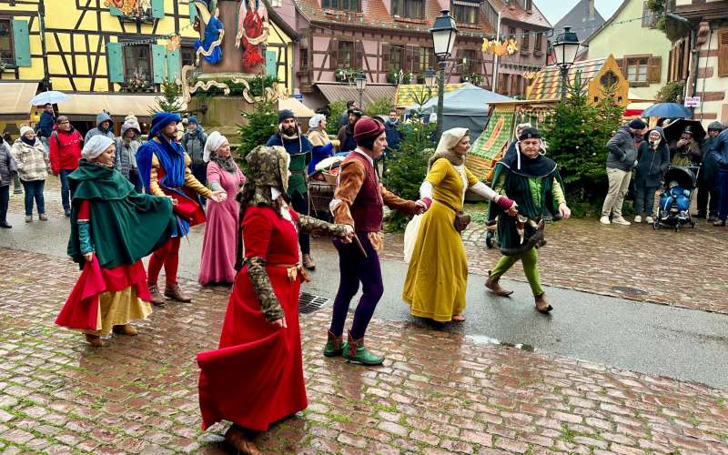Au moment de Noël, Ribeauvillé se pare de magie et plonge ses visiteurs dans une ambiance médiévale unique. La cité des ménétriers puise dans son riche passé pour offrir un marché de Noël médiéval à la fois original et spectaculaire. Dans les ruelles animées, gueux, manants, danseurs et baladins déambulent joyeusement, créant un véritable dépaysement. Les étals foisonnent de gourmandises salées et sucrées, de sanglier à la broche, de cervoise et de vin chaud, tandis que les amateurs de décoration trouvent leur bonheur parmi les couronnes de l’Avent, crèches artisanales et bougies. Véritable spectacle vivant, le marché de Noël de Ribeauvillé émerveille petits et grands par son atmosphère chaleureuse et festive.